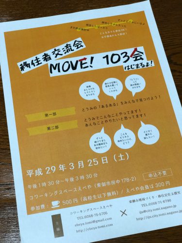 3月25日には、市内にあるコワーキングスペースえべやで、「移住者交流会 MOVE!103会」を開催します。