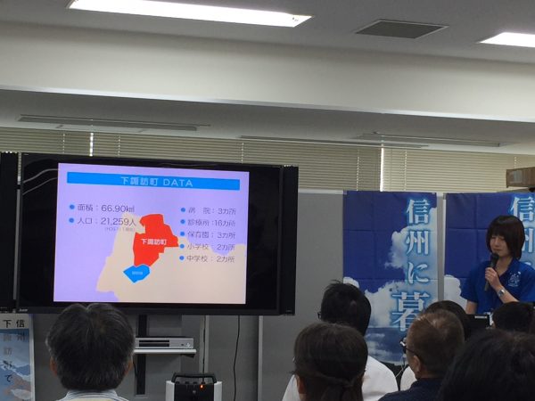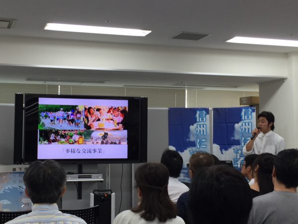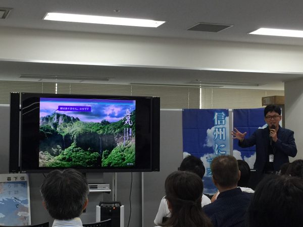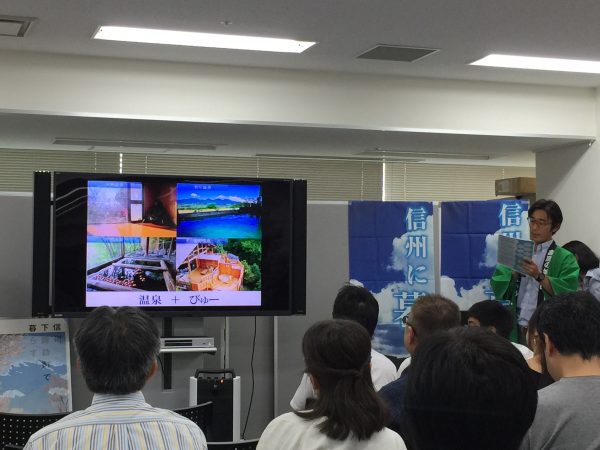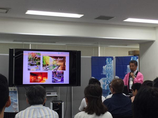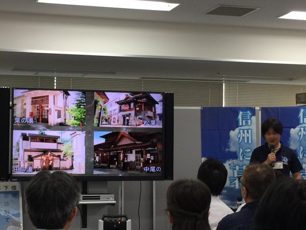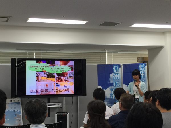 平成 28 年 6 月 19 日(日)に東京有楽町の交通会館にて楽園信州移住セミナーが開催 されました。今回は、「温泉のある暮らし」をテーマにして長野市、千曲市、須高地区 (須坂市・小布施町・高山村)、小諸市、山ノ内町、下諏訪町、箕輪町、野沢温泉村が 参加しました。また、移住者の体験談の発表がありました。