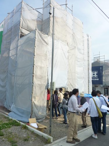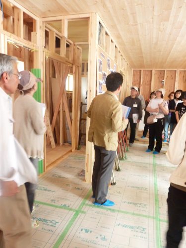 住宅の見学では、実際に建築中の家にに入って見学しました。木の香りが新鮮です。この地域は夏は約20度、冬は-10度まで下がるとして、30度近い温度差があるから家も寒冷地仕様になっています。