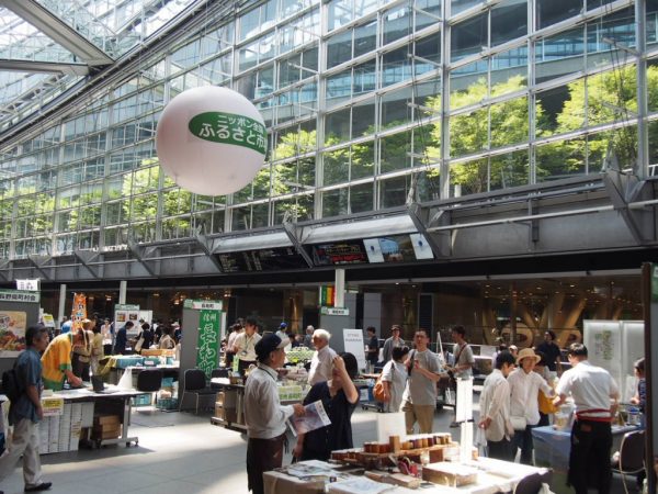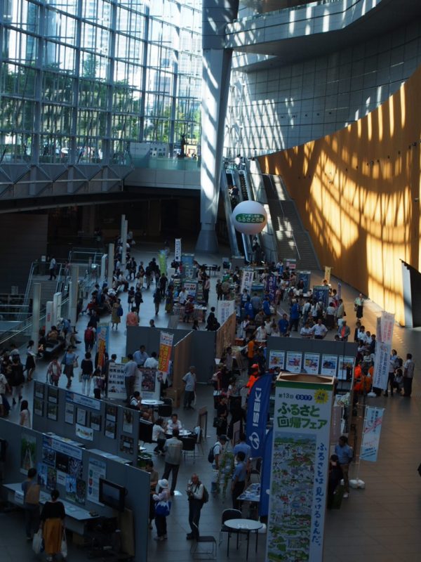 会場となった東京国際フォーラムは、JR有楽町駅から徒歩1分、JR東京駅から徒歩5分と駅からのアクセスがとてもいい会場です。ふるさと回帰フェアが開催されたホールEは、地下2階にあり、5,000㎡(およそ東京ドームの面積の10分の1)という広大な面積をもっています。天井が吹き抜けになっており、ガラスに囲まれたホールは地下1階のコンコースから内部を見ることができます。開放的で明るいホール内には、参加都道府県、市町村のブースがひしめきあっています。入場料が無料という事もあり、多くの参加者が絶えず会場に出入りしていて、とても賑やかなフェアでした。